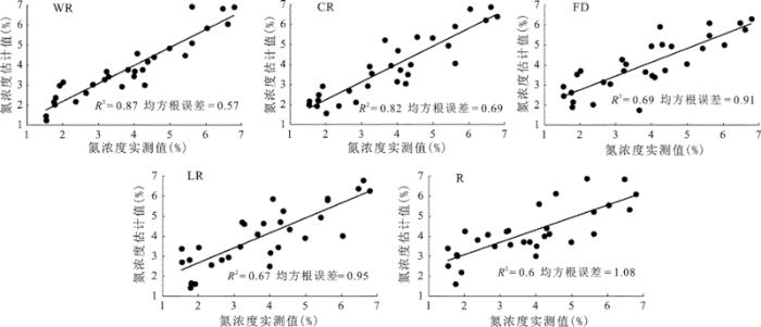 2) 对比不同光谱变换技术(包括WR、CR、FD、LR)和原光谱数据(R)预测芦苇叶片氮浓度的估算精度,WR的估算精度最高,原光谱数据的估算精度最低(R2=0.6,均方根误差=1.08)。
