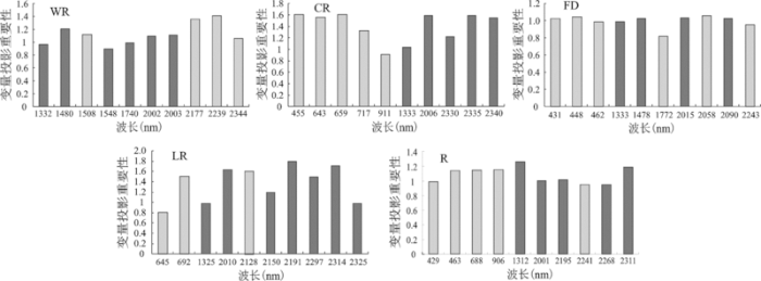 以盘锦双台河口湿地国家级自然保护区作为研究区,采用基于bootstrap的偏最小二乘回归模型(PLSR),分别构建不同光谱变换技术(包括光谱水分影响减小技术WR、包络线去除CR、光谱一阶微分FD、光谱倒数的对数LR)和原光谱数据(R)的芦苇叶片氮浓度预测模型。使用变量投影重要性指标VIP,计算了各光谱波段在估算芦苇叶片氮浓度时的重要性。研究结果表明,WR光谱变换技术的芦苇叶片氮浓度估算精度最高(R2=0.87,均方根误差=0.57),该方法可以有效减小叶片水分的影响,增强鲜叶片光谱中细微的氮吸收特征。