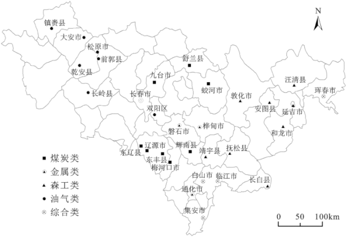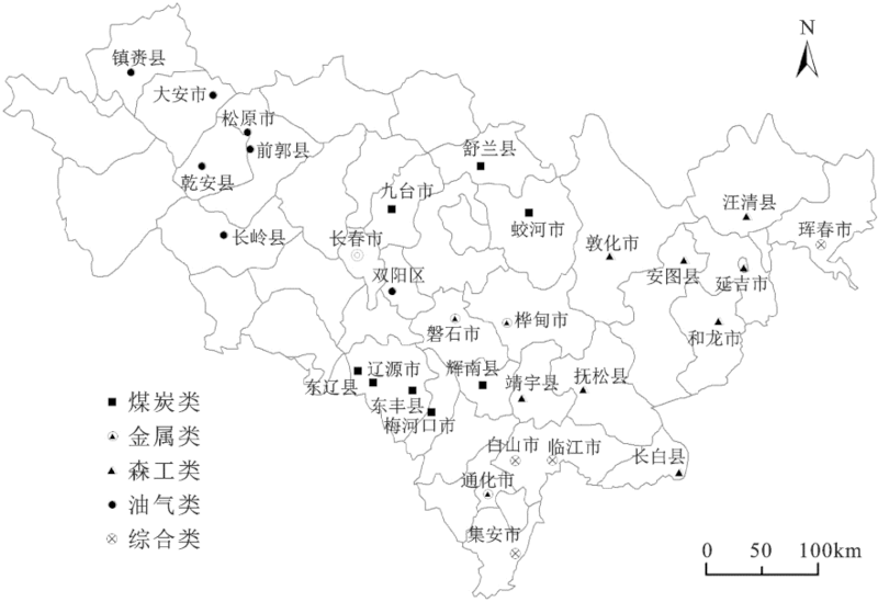 吉林省资源型城市主要有煤炭、石油、金属、森工等类型,本文参考《全国资源型城市可持续发展规划(2013~2020)》 [21]及《吉林省资源型城市可持续发展报告》[22],共界定资源型城市(县、区)31个,其国土面积、人口、地方生产总值分别占吉林省70%、50.6%、49%。吉林省资源型城市空间分布规律性明显,东部地区以森工资源型城市为主,主要包括在敦化、安图、汪清、和龙、靖宇、抚松。而中部地区以煤炭资源型城市为主,主要包括在舒兰、蛟河、辉南、梅河口、辽源以及九台,同时也有金属资源型城市分布,主要包括磐石、桦甸及通化。而西部地区则以石油资源型城市为主,主要包括镇赉、大安、前郭、乾安、长岭。其他类型城市主要有白山、珲春为代表的综合资源型城市(图1)。