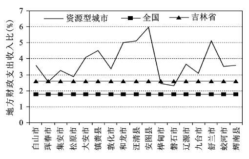 为避免行政区划重叠,在保证资源型城市特殊性基础上,本文对相应的资源型城市类型进行整合,最终归为19个典型资源型城市(县、区),其中地级市包括白山市、松原市、辽源市,县级市(县)包括珲春市、集安市、大安市、镇赉县、敦化市、和龙市、汪清县、安图县、桦甸市、磐石市、九台市、舒兰市、蛟河市、辉南县,市辖区包括双阳区和二道江区。若无特殊说明,本文所涉及指标数据均来自吉林省各资源型城市相关单位《资源型城市转型情况调查表》问卷调查数据(其中2009年数据反馈不全,未统计在内),全国层面指标数据来自2009年《中国统计年鉴》[25]。