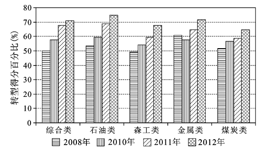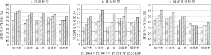2012年石油类城市均已达到或超越基本转型阶段,其中双阳2010年前后实现跨越式发展,2011、2012连续2 a得分超过65分,已经接近成功转型。而森工类城市中,仅敦化市达到基本转型阶段,2012年得分为65分,接近成功转型,但和龙、汪清、安图得分较低,仍处于过渡阶段。煤炭类城市转型效果最差,仅有辽源、九台取得较好转型效果,处于基本转型阶段,而其他3城市均处于初步转型或过渡阶段。