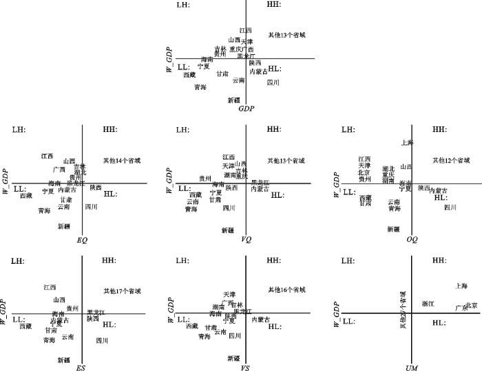 Moran’s I指标表现的是全局空间自相关性,不能详细展示局部空间聚集特征,且忽略了空间自相关性只存在于部分地区或者正负相互抵消等可能性[19]。因此,本文从Moran’s I散点图分析局部空间自相关性,更加清晰明了地展现各省域展览业发展与周边省域经济发展之间的相关性。如图1所示,中国省域经济的Moran’s I散点图中共有19个地区处于第一、第三象限,占31个省市自治区的61%,表明2013年中国经济发展主要呈现高高聚集(HH)和低低聚集(LL)两种空间聚集格局,证实了中国经济发展正的全局空间自相关性;在6幅展览业发展指标与省域经济之间的双变量Moran’s I散点图中,除了UM与周边相邻地区实际GDP的空间自相关性不明显以外,都证实了展览业发展与周边省域经济发展存在较强的相关性,存在空间溢出效应的可能。从展览、展馆两个维度来看,中国东部沿海地区都位于第一象限,说明东部沿海展览业发展水平较高,与周边省域经济的相关性也较强;位于第二象限的江西、山西、贵州等地展览业水平较低,但周边省域经济水平较高;西藏、新疆、云南等地一直位于第三象限中,说明这些省域展览业发展及周边省域经济水平都较低。