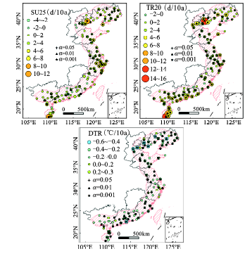 渤海沿岸大部分在0.0~2.0 d/10a之间,且大部分站点都通过了0.05水平以上的显著性检验。黄海和东海沿岸大部分站>2.0 d/10a,且大部分都通过了0.01水平以上的显著性检验,其中长江三角洲有7站>4.0 d/10a,通过了0.001水平的显著性检验。TR20有104站呈上升趋势,占总气象站的95%,并大部分都通过0.001显著性检验水平。黄海、东海沿岸大部分站点上升趋势平稳,在2.0~4.0 d/10a之间。南海沿岸上升幅度最大,大部分站>4.0 d/10a,其中海南徐闻站上升率达到15.53 d/10a。DTR有81%的气象站呈下降趋势,下降趋势明显的主要分布渤海沿岸,且基本都通过0.001水平的显著性检验,其中河北廊坊站为-0.58℃/10a。有62站变化趋势在-0.2~0.0℃/10a之间,主要分布在黄海和东海沿岸,且大部分都通过0.01水平的显著性检验。有16站呈上升趋势,占所有气象站的14%,上升幅度最大的为河北承德站,达0.26℃/10a。