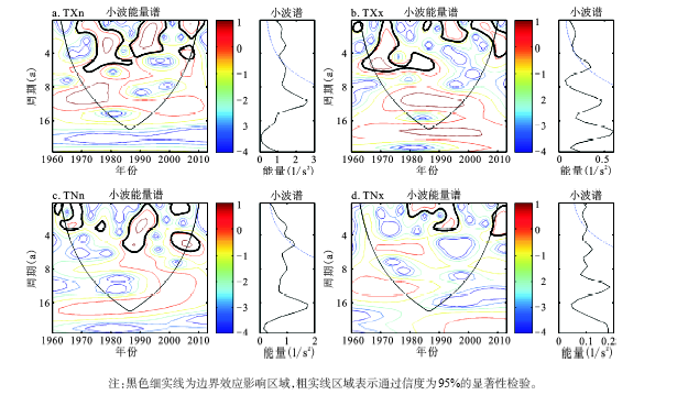 从图4c可以看出TNn通过95%显著性检验的频域和时间域聚集中心有4个,其中心坐标分别为:(3,1967)、(5,1990)、(2,2003)和(5,2005)。同时,每个坐标为中心的气温指数小波能量在时域尺度上的强集中影响范围分别是1963~1971年、1984~1996年、2000~2007年和2000~2010年。从图4c小波谱中看出,TNn存在3 a、5 a、8 a和17 a左右的振荡周期,但3 a和5 a通过95%显著水平检验,且二者5 a振荡周期较强,因此TNn的主周期为5 a左右。
