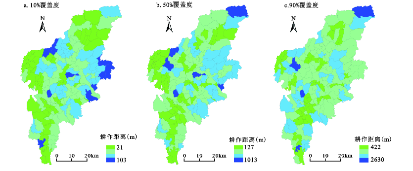 图3反映了10%,50%,90%共3组不同覆盖度下的耕作半径分布结构。从地理范围方面分析,耕作半径最大的区域主要分布在东北部、西南部与东南部的山地;耕作半径较小的区域,主要分布在中部及其偏南方向,尤其是中部偏南的区域比较集中。值得关注的是,部分地区,如西部地区和西南部地区和中东部地区,耕作半径随着覆盖度的变化出现了较大的变异性。