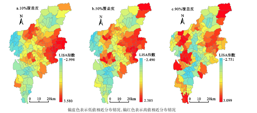 通过ArcGIS软件进行LISA分析,得到结果如图4所示,图上分别展现10%,50%,90%共3组不同覆盖度下耕作半径在局部尺度下空间变异情况。与图3相比较,图4采用LISA分析可以更好的发现研究区上的耕作半径上的变异情况。可以看出,研究区的西部、北部、东南部部分地区由低值聚类转为高值聚类状态,说明了这部分地区的耕作半径随着覆盖度上升,出现了快速增长现象,并基本保持相似增长状态;研究区的东部由高值聚类转为随机,说明这部分地区的耕作半径随着覆盖度的上升,耕作半径由趋同转向差异较大的状态。