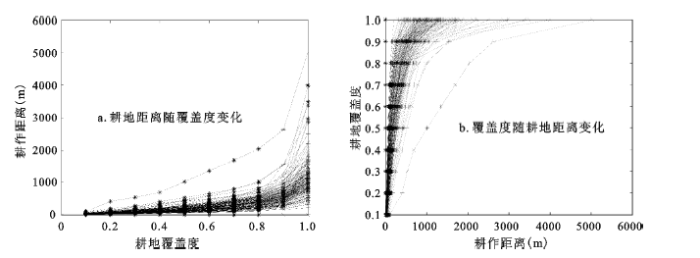 可以看出,采用上述方法的计算,如果耕地紧密的围绕在一个居民点的周围,则较小的h值对应着较大的覆盖度,并且当h增大到一个相对较大的水平时,覆盖度的增长便会放缓。相反,如果耕地较为分散在居民点的周围,那么当h较小时,覆盖度也会比较小。
