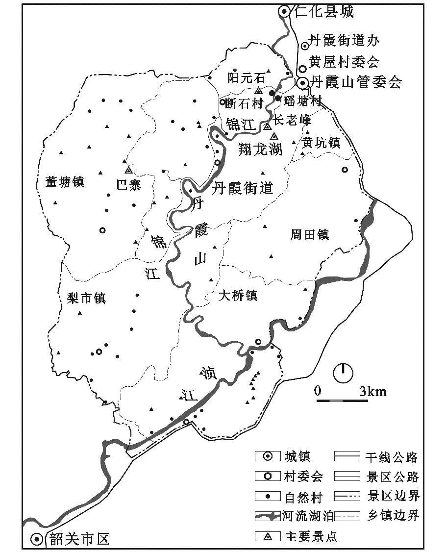 丹霞山位于广东省韶关市,总面积292 km2,现由韶关市丹霞山管委会管辖。1980年,丹霞山对外旅游开放,以长老峰为主要景点,在经历最初几年的快速发展后进入近10 a的停滞发展期,游客量徘徊在25万人次左右。自1995年起经历3个快速发展阶段:一是在1995年阳元石和翔龙湖两个新景区开放以后,至2003年游客量达到73万人次;二是在2004年申报世界地质公园成功后,至2009年游客量达到204万人次;三是在2010年获批世界自然遗产后,到2014年游客量达到284万人次。瑶塘村和断石村位于丹霞山内,两村仅有一河之隔,同属仁化县丹霞街道黄屋村委,受丹霞山管委会和仁化县政府共同管辖。瑶塘村位于丹霞山北大门进山主干道前往阳元石和长老峰景区的三岔路口上,是两个景区结合部上的重要节点;断石村位于锦江西岸的冲击平原上,背靠阳元山,扼守着阳元石景区入口(图1)。至2014年底,瑶塘村共有农户44户,户籍人口168人,外来人口约100人,曾先后获得“韶关市级奔康标准村”、“广东省级新农村示范片建设主体村”等称号;断石村共有农户69户,户籍人口213人,外来人口约160人,曾获得“韶关市级文明村”称号;两村所属的黄屋村是“中国乡村旅游模范村”。1980年以来两村依托丹霞山,在地方政府、外来资本、农村社区、旅游移民和旅游者等主体的共同作用下,逐步从以农业生产为主到全面参与旅游发展,“离土不离乡”就地实现了生产和生活方式的转变,表现出有别于国内其他地方的农村城镇化过程和运行机制,因此以其为案例探索旅游引导下的新型农村城镇化路径具有一定的学术价值和参考意义。