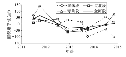 统计计算28个断面每条断面同一基准面以上全断面面积,并为对比不同断面的冲淤变化计算了各断面全断面面积的距平值。求游荡段(巴彦高勒至三湖河口)、过渡段(三湖河口至昭君坟)和弯曲段(昭君坟至头道拐)3个河段及全河段各年汛前汛后断面面积距平值的平均值(图2)。可见,近4 a内,2011年汛期内蒙河段整体断面面积有少量的增大,即少量的淤积;从2011年汛后至2012年汛后面积明显的减小,即表现为断面的冲刷过程;2012年汛期之后总体呈现持续淤积的过程。分河段看,弯曲段和过渡段与整个河段相似,都是在2012年表现为大幅度冲刷,其他时段为淤积或少量冲刷;而游荡段在2011年汛后至2012年汛后也表现为冲刷,但其后至2014年汛后总趋势仍为冲刷,且主要为汛期中的冲刷。