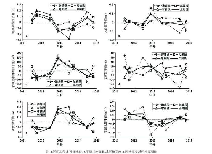 河槽宽度变化过程如图3d所示,显然,游荡段表现出较大的起伏变化,而过渡段和弯曲段变化不明显。2014年汛后相对2011年汛后整个河段河槽宽度平均增加约4.6 m,为河槽宽度的0.88%。与河槽宽度不同,平均深度变化幅度较大(图3e),而且分河段及整个河段平均深度显示出与漫滩过水面积(图3c)相似的变化过程。2011年汛后至2014年汛后整个河段河槽平均深度增加了0.13 m,为2011年汛后河槽平均深度的4.9%,其中游荡段、弯曲段河槽平均深度都增加了0.20 m,而过渡段河槽平均深度减少了0.086 m。这几年中以2012年汛期河槽深度增加最大。由此可见,过渡段、弯曲段在冲淤过程中,以河底的冲淤为主;而游荡段河底和河岸冲淤幅度都比较大。