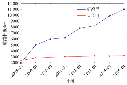 以旧金山和新德里地区道路数据为例,统计每年道路数据总量的变化,其在2008-2015年的道路长度统计如图1所示。