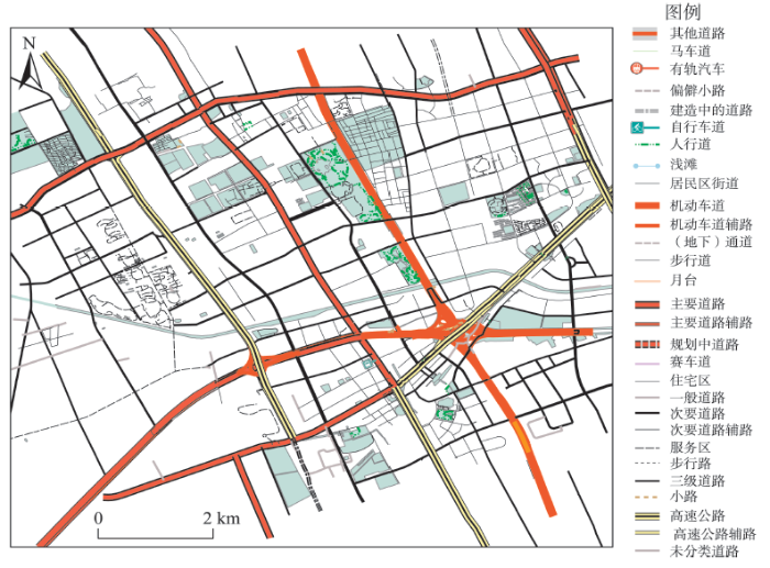 通过建立缓冲区的方法获得道路的精度。首先将区域内导航道路数据设置20 m的缓冲区,以落在导航道路数据缓冲区的OSM道路比例作为OSM数据的道路精度,用D表示。