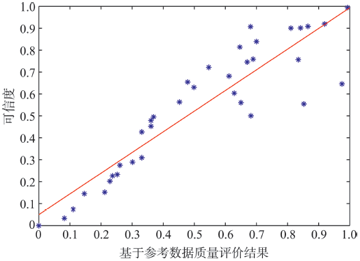 将各个瓦片的计算结果绘制成散点图(图3)。从图3可以看出,2种方法的评价结果整体保持相同,图中红线为趋势线,其中R2=0.8268,表明2种评价结果基本呈现线性相关的关系。尤其在数据质量低于0.5的区域内,2种评价方法的结果较为一致,表明在数据质量较差时,采用可信度的评价方法能够较好地预测出数据的真实质量;当数据质量较高时,除了少数可信度的评价结果与真实数据质量结果上下波动外,其余结果也能够保持较好的一致性。