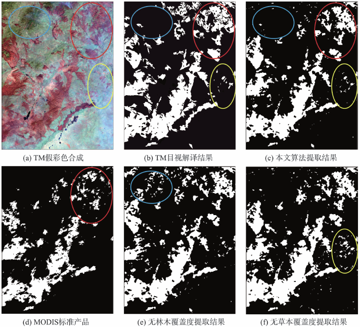 图3(e)则是同样采用dNBR阈值法,仅利用草本覆盖度数据、没有利用林木覆盖度数据的对照结果,可以看出蓝色椭圆内,误判现象非常明显,而蓝色椭圆的主要土地覆盖类型是混交林。图3(f)是利用林木覆盖度、没有利用草本覆盖度数据的对照结果,对林木覆盖度小于10%的区域,dNBR阈值设置为150,该提取结果在黄色椭圆内的误判现象明显,而且在火烧迹地的边缘部分,将一些非火烧迹地像元误判为火烧迹地。由图3(e)和图3(f)的对比可知,利用植被覆盖度数据,可以提高火烧迹地提取的精度。
