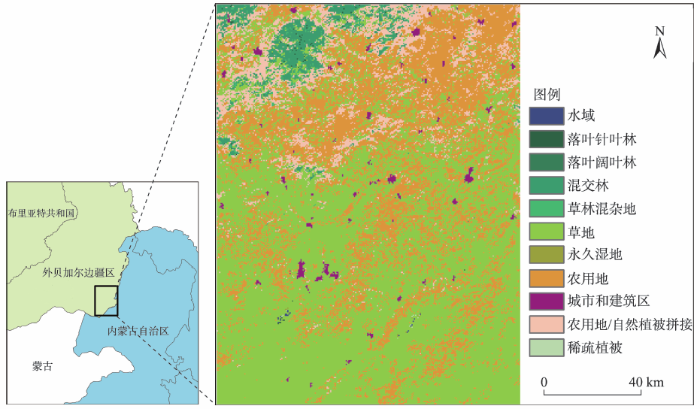 本文的研究区位于俄罗斯外贝加尔边疆区与中国内蒙古自治区交界处,面积约211万km2。该区域属温带大陆性气候,冬季漫长寒冷,夏季温和短暂,降水主要集中在夏季。春秋两季,由于大陆性气候的影响,该区域森林火灾频繁发生。有研究表明外贝加尔边疆区是俄罗斯西伯利亚联邦区的火灾高发区[21]。该区域的土地覆被状况如图1所示,北部有小部分林地,以混交林为主,南部是农用地、草地。在农用地与林地、草地的交接地带,还有部分的农用地/自然植被拼接地。城市和建筑区只有很少的一部分散落在研究区内。