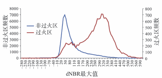 Fig. 2 Frequency distribution of the maximum dNBRvalue in the burned scar area and unburned region