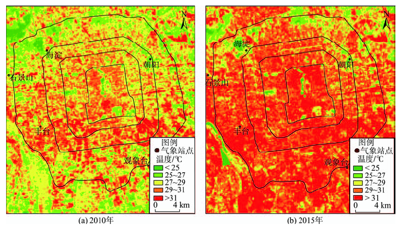Tab. 3 Distribution of heat island intensity of different density regions between different ring roads in 2010 and 2015