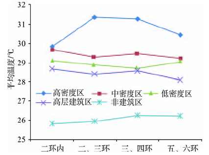 对北京市五环内各个环线之间的不同密度区平均温度进行统计,可以发现各个环线内不同密度区平均温度分布规律大体一致,即高密度区平均温度最高,高层建筑区的平均温度最低(图7)。由于北京2环内的建筑主要为高密度建筑和中密度建筑(图2),低密度建筑和高层建筑的分布较少,地表温度主要受高密度区和中密度区影响,因此二环内各个密度区的平均温度相差较少。二、三环内高密度区平均温度达到31.37 ℃,三、四环之间高密度区平均温度为31.29 ℃,二、三环和三、四环之间高密度区的面积比例较少但平均温度明显高于其他密度区,而中密度区、低密度区和高层建筑区的平均温度差距较小。四、五环之间高密度区平均温度为30.45 ℃,而高层建筑区的温度明显较低,仅有28.09 ℃。此外,各环线的非建筑区平均温度明显低于建筑区的平均温度。