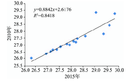 由于所选取的2期遥感影像的成像时间不同,经反演所得的地表温度数据不能直接进行比较,需消除由于大气过程导致的地表温度之间的系统偏差。由于水体的温度比较均一,如果没有周边建筑物或人为活动的影响,水体的温度可代表周围环境背景温度。本文选择城市郊区远离建筑物的水体,通过统计对应的2期水体温度,进而计算2期数据之间的函数关系,然后通过栅格计算消除2期遥感反演地表温度数据之间由于天气过程导致的系统偏差。通过提取和对比2010年和2015年2期遥感反演地表温度数据中的水体温度,得到2期地表温度数据之间的函数关系(图5),关系式为y=0.8842x+ 2.6176(R2=0.8418),根据关系式对2015年的地表温度数据进行栅格计算即可得到订正后的2015年地表温度数据。