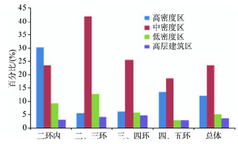 图6 北京市各环不同建筑密度区面积比例