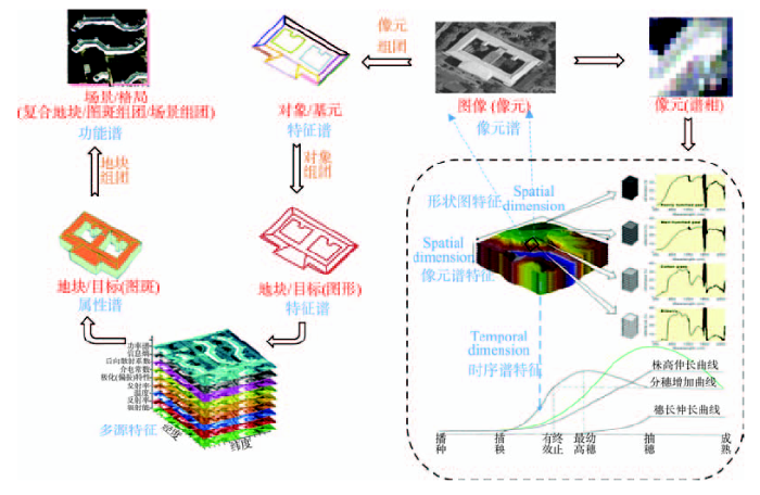 (2)遥感信息的“谱”特征,是指遥感信息在地物光谱、时间、功能等属性上的表征,具有明显的区域相关性,适合序列化表达[42]。“谱特征”更倾向连续化表示,以序列、动态的体系定量系统地表示地理信息。如图1所示,在光谱维,地物在不同波长的反射特性可以拟合成为电磁波谱曲线;在时间维,植物在不同时相的生长特性(叶面积指数、植株高度等)可以拟合成为地物生长曲线;在功能维上,商业区、居民区、高速立交、海滩等不同功能区划区分了不同的场景和地物利用方式。上述3个方面从微观上反映了地物本身区别于其他地物的特性。这种“谱相”信息表现了不同地物在光谱、时间、功能等维度上的特点,可表征遥感关于地物“What”、“When”、“How”的信息,反映了不同地物的“内在机理”和“外在效应”。