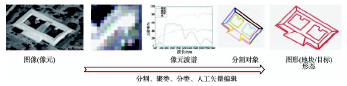 该阶段是要回答地物在哪里(“Where”)的问题;核心内容是考虑如何利用遥感影像本身的像元波谱值等视觉特征划分出具有合理边界的地块,需从遥感影像辐射波谱特征的“谱信息”出发,结合多尺度表达技术提取精细的几何空间“图”信息,建立遥感像元波谱与地物目标几何结构的相互转化关系。该阶段是“数据