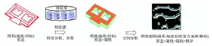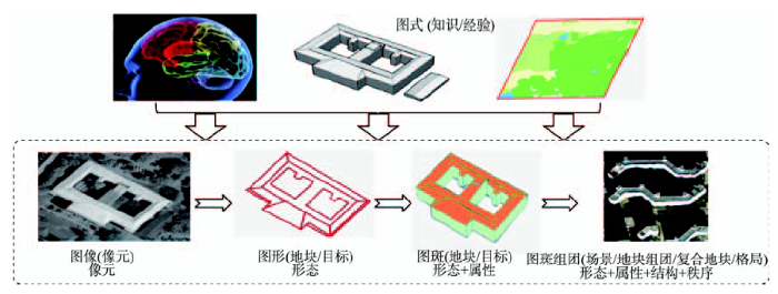 “图谱协同”是指对空间“图”上的地块进行多维“谱”的定量渲染,实现“图-谱”耦合,以及尺度空间、定量模型和语义逻辑相结合的多重表达(图4)。目的是在地块图形的形态信息基础上加载多源定量谱信息(提升地块的特征信息维度,增强其表达描述),再结合定量模型来判别地物属性、指标及其时空变化,形成具有地学意义的地理图斑单元或其组合(具有明确地类属性的简单地块/目标:形态+属性;或具有明确地类属性的复合地块/目标:形态+属性+结构+秩序)。这个由“图形:地理空间图+特征谱”→“图斑:地理空间图+属性谱”→“图斑组团:地理空间图+属性谱+功能/秩序谱”的转化过程可表述为“地块的分析与识别”(地块/目标Geo-object:形态→地块/目标Geo-object:形态+属性→地块组团/复合地块/复合目标/场景/格局Scene/Patterns:形态+属性+结构+秩序),图谱特征在此耦合,追求的是定性化判断地块类型、定量化计算地块指标、语义化拓展地块属性。