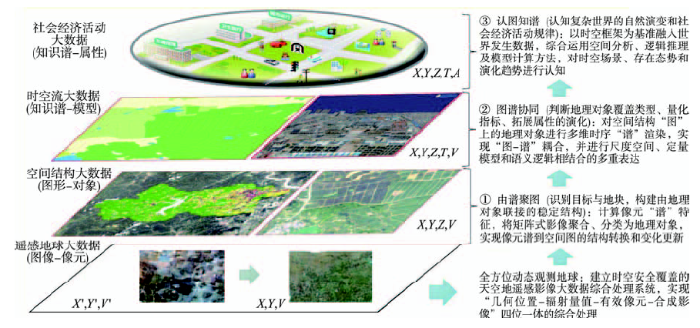 综上所述,遥感图谱认知就是要结合高分遥感对地物目标几何图和特征谱的双重成像优势,发展“由谱聚图-图谱协同-认图知谱”三段体系(图6):以遥感地球大数据基准影像的全覆盖有效合成处理为起始,逐步构建空间结构信息底图并精确融入时空序列大数据、社会经济活动大数据,为各行各业具有时空位置特性的大数据价值密度的提升奠定理论基础。