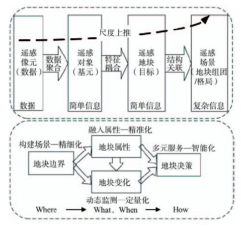 (1)一方面是认知过程中以“像元→对象/基元地块/目标→场景/地块组团/格局”为主要载体的自底向上分层递进过程,逐步从“数据层→特征层信息层→知识层”进行抽象,语义越来越明确,对地物的认知也越来越清晰;