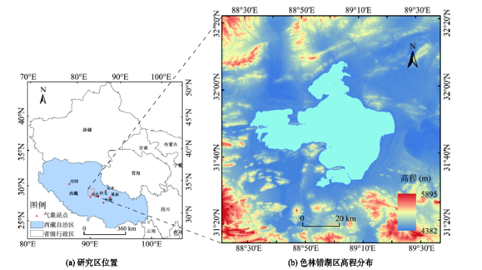 色林错湖是西藏地区第一大湖,中国境内第二大咸水湖,属于青藏高原形成过程中产生的一个构造湖[18],位于冈底斯山北麓,申扎县以北,地处西藏自治区申扎、尼玛、班戈3县的交界处,空间范围为31°34′~31°57′N,88°33′~89°21′E[10]。湖面平均海拔4530 m,湖体东西长72 km,南北宽22.8 km,最大水深超过33 m。色林错湖湖区地势略低于周围区域(图1)[12,19],位于水流的汇聚中心,发源于格拉丹东、唐古拉山、吉热格帕等雪山的扎加藏布河流,于北岸入湖;发源于巴布日雪山的波曲藏布河流,于东岸入湖;发源于格仁错东部甲岗雪山的扎根藏布河流,于西岸入湖。因此,色林错湖水源的补给属于冰川融水补给。