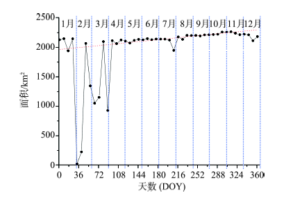 色林错湖区的雨热季均集中在每年的6-9月,冰冻期在每年的1-3月,通常情况下,湖水水位在10-11月达到年内稳定最大值。以2005年为例,利用8 d合成的MOD09A1地表反射率数据提取一年内色林错湖面积的变化情况(图2),由于云的覆盖和湖面结冰导致前期(第25-89天)湖泊的提取面积变小,第33天整个湖区被云覆盖,致使湖泊的提取面积几乎为0,从第289-321天(10-11月)湖泊水位达到年内的稳定最大值。从图2可看出,色林错湖湖泊面积一年内每8 d的变化率大于0,表明其呈季节性扩张显著,而本文主要研究色林错湖面积的年际变化,为减少因季节变化导致的湖面差异,在遥感数据的选择上均选择11月的数据(表1)。