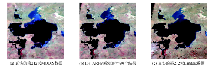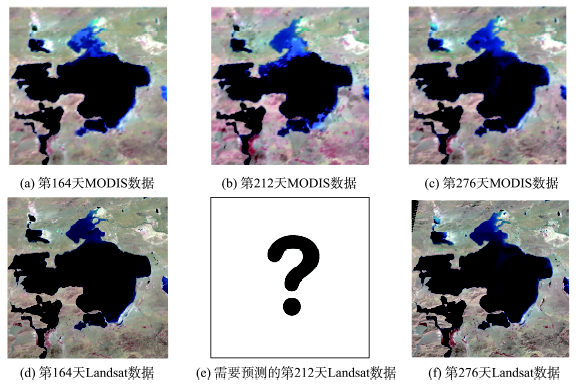 以2007年第164天(图4(a)、(d))和第276天(图4(c)、(f))的MODIS数据与Landsat数据影像对作为ESTARFM模型的输入数据,来预测第212天Landsat-Like数据为例,检验了ESTARFM时空融合结果的准确性与实用性。