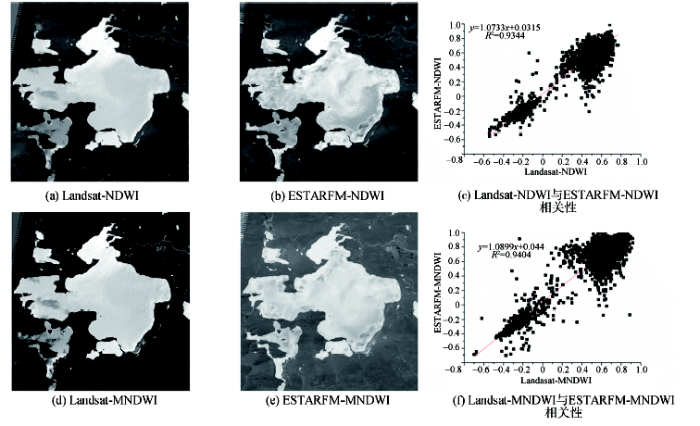 Fig. 6 Comparison of two types of water index and the correlation of data fusion by ESTARFM and the actual Landsat