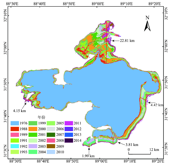 基于本文研究方法提取得到了1976-2014年色林错湖空间分布范围,分析了色林错湖近40年湖面面积的时空变化情况(图8)。由图8可看出,色林错湖从1976-2014年湖面面积呈较为显著的持续增加趋势:(1)近40年来,色林错湖向北扩展了22.812 km,向西扩展了4.146 km,向东扩张了4.421 km,最大扩张范围可达7.484 km;(2)2003年前后,雅根错湖西南方向派生出一个新的小湖区,并向外扩张了约1.990 km,2004年前后,色林错湖南部湖区在昌都岗处与雅根错湖连为一体,随后雅根错湖又向南扩张了3.806 km。