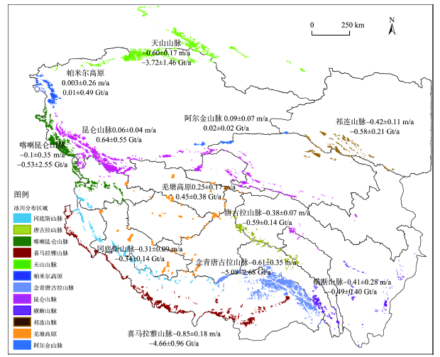 天山山脉 | ICEsat/GLAS | 2003-2009 | -0.58±0.21 | 文献[2] |