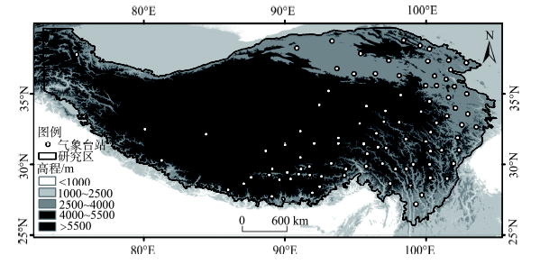 研究区为海拔大于2500 m的青藏高原地区(图1),位于73°~105°E,25°~40°N之间,总面积约为296.8万km2。研究区平均海拔为4367 m。青藏高原四周都是大山脉,积雪主要集中在这些山脉地区,包括南部的喜马拉雅山、西部的喀喇昆仑山、北部的昆仑山、东北部的祁连山、西南部的横断山等。