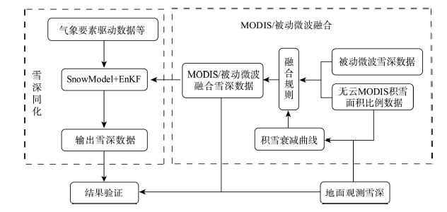本研究中将积雪过程模型(SnowModel)模拟的积雪状态变量(雪深)作为反演的先验知识,通过集合卡尔曼滤波(EnKF)算法融合雪深的观测信息(MODIS/被动微波融合雪深数据)。随着模型系统的运行,不断的引入观测,最终获取同化后的雪深数据集。