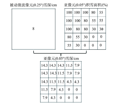 融合算法包含2个基本假设:(1)低分辨率的被动微波像元的雪深值代表该像元区域内雪深的平均值;(2)被动微波像元的雪深可以根据其亚像元的积雪面积大小进行线性的重新分配。因此,根据被动微波像元雪深值以及每个亚像元的积雪面积比例值,可计算出每个亚像元的雪深大小。图4为该融合算法的示意图。