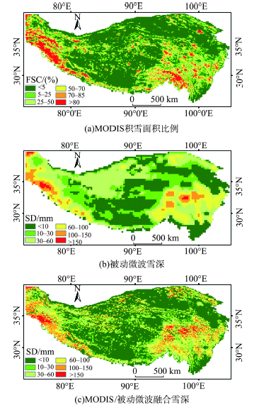 自20世纪60年代初期,从可见光到微波的一系列遥感传感器已在积雪研究中发挥了重要的作用。在气候与冰冻圈(CliC)、地球观测系统(EOS)、寒区陆面过程实验(CLPX)等的国际研究计划中,积雪遥感都被赋予了重要的位置。积雪遥感中最常用的波段是可见光、近红外和微波。其中,可见光和近红外波段主要用于提取积雪面积,特别是自Terra和Aqua卫星发射以来,因其携带的MODIS传感器具有较高的光谱及时空分辨率,决定了它在积雪面积监测中的绝对优势,已发展成熟的MODIS积雪制图算法[10-11]和全球的MODIS积雪面积产品[12]得到了广泛的验证和应用,但光学遥感最大的弱点是不能用于反演雪深以及易受云的影响。被动微波遥感不仅能够全天时、全天候地观测积雪,也能够穿透大部分积雪层以探测雪深信息,而且其时间分辨率高,能够迅速覆盖全球,在监测全球和大陆尺度的积雪时空变化中发挥重要作用,也已经发展了较为成熟的雪深反演算法和遥感产品[13-16]。然而,由于积雪属性(面积、深度、粒径、密度等)的非均匀分布以及被动微波遥感空间分辨率极低(约25 km)的缺点,使利用被动微波遥感提取的雪深信息存在较大的不确定性[17-18],这在雪深较薄且呈非连续分布的青藏高原尤为突出。因此,利用其他较高空间分辨率的积雪遥感数据产品,特别是高质量的MODIS积雪面积产品,以更好地表达低分辨率的被动微波遥感雪深数据像元内的异质性,是提高雪深数据精度的有效途径。