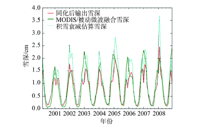 本文通过结合多源遥感数据、分布式积雪过程模型(SnowModel)以及同化的方法来提高研究区雪深反演的精度,重建研究区的雪深数据。结果表明:利用地面站观测雪深数据以及MODIS积雪面积比例数据较好地拟合了研究区的积雪衰减曲线;基于数据同化方法得到的雪深数据更接近地面观测雪深的“真值”;通过均方根误差以及相关系数的对比可知,同化雪深结果明显优于MODIS/被动微波融合雪深结果,而MODIS/被动微波融合雪深与地面台站雪深之间存在较大的偏差。
