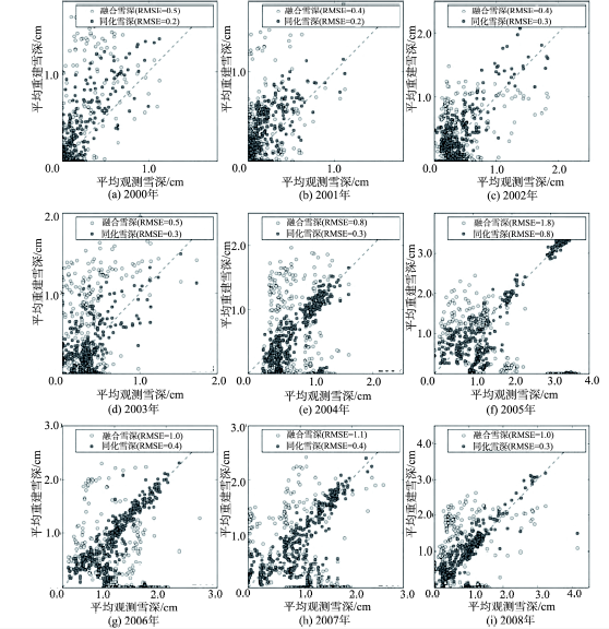 从图8可看出,经过同化后得到的雪深数据更接近地面观测的雪深“真值”。近9年的比较结果中,同化后雪深数据的均方根误差(RMSE)在0.20~0.82 cm之间,相关系数(R)在0.61~0.87之间;而MODIS/被动微波融合雪深的均方根误差(RMSE)在0.40~1.79 cm之间,相关系数(R)范围为0.27-0.55。每一年的评价结果中,与MODIS/被动微波融合雪深数据相比,同化后的雪深数据的均方根误差(RMSE)都降低,精度得到改善,特别是在2005、2006、2007和2008年。