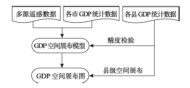 在对基础地理信息数据归并等处理的基础上,首先,利用夜间灯光数据、不同分辨率的人口密度分布数据作为代用数据,将研究区市级GDP统计数据空间展布到栅格单元上;其次,利用县级GDP统计数据进行误差分析,比较代用数据对GDP空间分布的表达效果。具体的空间化技术流程如图1所示。