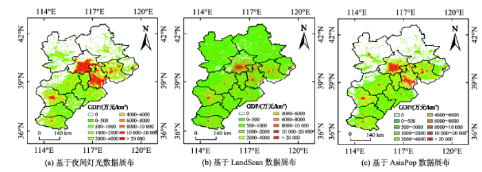 基于相关性分析结果,根据上述空间化方法以代用数据空间密度分布为依据,利用ArcGIS 10.2平台将上述3种代用数据的市级GDP空间展布到栅格单元上,得到基于不同代用数据的京津冀地区市级GDP空间分布栅格图(图2)。由于代用数据生成所依据的原始信息差异以及表现出来的空间分布特征,相对于LandScan的GDP空间化结果,夜间灯光和AsiaPop空间化的空间格局更加接近,特别是在河北北部一些县区GDP主要集中在市辖区及周边,GDP零值呈大片分布,相反LandScan的GDP零值仅有零星分布。