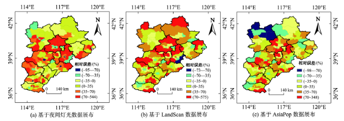 表3从极值统计角度分别列出了不同代用数据下的正、负相对误差最大的前10个县区,根据行政区划分为市辖区和市郊区县。从表3可看出:(1)夜间灯光数据相对误差大于300%的5个县区都集中在北京市,相对误差最大的延庆县GDP模拟值甚至达到实际值的6倍多,而经济比较发达(人均GDP相对较高)的市辖区GDP往往被低估,比如北京市西城区和东城区;(2)LandScan数据相对误差大于200%的6个县区集中在北京市和天津市,市郊区县GDP也往往被高估,同时市辖区也存在GDP高估的问题,低估极值区县主要为经济比较发达的市辖区、新区(如滨海新区)或县级市(如武安市和沙河市);(3)AsiaPop数据高估GDP误差最大的10个区县中前4个来自天津市,后4个来自河北省市郊区县,而低估最大的前10个县区主要为河北省市郊区县。进一步分析县级GDP的空间展布相对误差空间分布(图3),可以看出基于夜间灯光和LandScan的GDP空间展布误差格局比较接近。