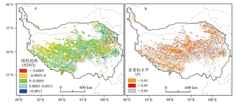 图4 1982~2013年青藏高原生长季NDVI均值线性变化趋势(a)及显著性水平(b)空间分布特征