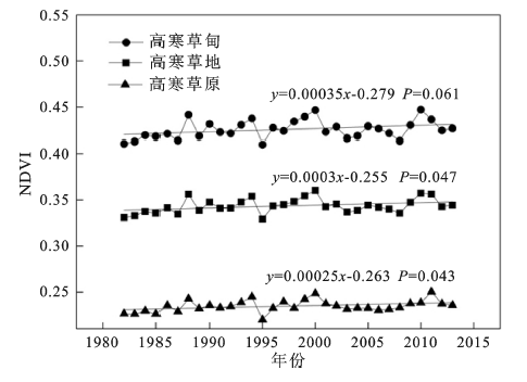 图2 1982~2013年不同草地类型生长季NDVI均值年际变化趋势