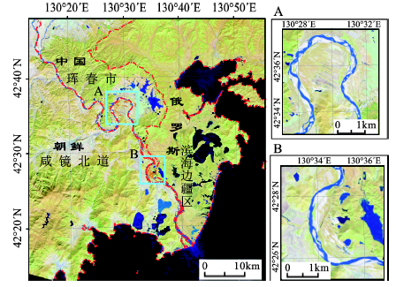 圈河流域位于图们江下游,地处敬信盆地南缘,沉积环境以第四纪更新世冲洪积为主,发育的土壤为草甸暗棕壤。具有显著的温带大陆性气候特点,因距日本海较近,也受到海洋性气候的影响,年平均气温为5.9℃,最高气温32.9℃,最低气温-24.5℃,降水量变化大,季节分布不均。该区是中、朝、俄三国交界鼎足地带[16],圈河的北岸是中国吉林省延边朝鲜族自治州,南岸是朝鲜咸镜北道,东岸是俄罗斯的滨海边疆区(图1),区内湿地资源丰富。圈河两岸地势平坦,平均海拔约16 m,河道坡降较小、水面宽阔,河床以细砂为主,多汊流、江心洲、边滩分布。沿河两侧的沙丘主要分布在圈河流域中段,以及河流末端临近日本海入海口附近,面积约16 km2。河岸沙丘以新月形和抛物线形为主,沙丘主体多以舌状蔓延形式向前迁移,年均移动速率约为0.5~3.6 m。多期遥感影像对比发现,伴随沙丘因沙源供给减少、植被定植而自然固定的同时,部分固定沙丘的前缘也呈现活化现象。河岸沙丘的形态发育,受控于自然因素(区域风况、沙源供给、植被覆盖等)和人文因素,因此,在相似区域地理条件下,考虑沙丘发育演化与人类活动干扰强度的关系,本研究选取2个典型区,分别位于42°34′N~42°37′N,130°27′E~130°32′E(面积64.99 km2)(图1A)与42°26′~42°29′N,130°33′~130°36′E(面积41.16 km2)(图1B),这2个样区也是圈河流域沙丘分布的集中区。其中,A区地势平坦,平均海拔12 m,圈河在此处河床曲折率大于1.5,河岸沙丘分布在河谷的南侧,以固定、半固定、流动抛物线形沙丘为主,该区受人类活动影响较小;而B区位于圈河洋馆坪至防川村段,平均海拔9 m,沙丘分布在NNW-SSE向河谷右岸,以流动新月形沙丘及沙丘链为主,珲春政府在现有沙丘基础上开发了以旅游观光为主要盈利方式的沙丘公园,面积12 km2,2002年被批准为国家级风景区。这2个样区包含了圈河流域河岸沙丘分布的主体,且各样区沙丘发育的类型、形态参数、受人类干扰程度不同,因此,对其开展研究有助于揭示圈河流域河岸沙丘动态演化特征与规律。