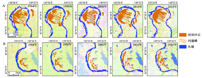 从2015年遥感影像可见(图2),河岸沙丘主要分布在河流的右岸。沙丘类型有抛物线形沙丘、新月形沙丘、纵向沙垄等风沙地貌类型,沙丘总体走向WNW-ESE。其中,A区风沙地貌面积7.06 km2,主要分布在圈河九曲的南侧,位于北朝鲜境内,以固定抛物线形沙丘为主,以及由抛物线形沙丘前缘、丘臂活化而形成的新月形沙丘和纵向沙垄,此外,也有小面积风蚀坑分布。从抛物线形沙丘长宽比分析,呈叶形(叶形指数LLWR在1.0~3.0之间)结构,具有较成熟的抛物线沙丘长宽比特点。B区风沙地貌面积8.65 km2,主要分布在圈河右岸,位于中国珲春市敬信镇境内,以新月形沙丘链为主,以及由抛物线形沙丘前缘活化而形成的小面积单体新月形沙丘。