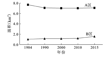 通过对研究区近31 a遥感影像解译数据分析,得到圈河流域河岸沙丘面积变化信息(图3)。研究期内,圈河流域河岸沙丘面积总体呈减少趋势,净减少0.09 km2。但各样区风沙地貌面积变化趋势各异,其中,A区面积总体呈减少趋势,净减少0.63 km2,1984~1990年减少速度较快,年均减少0.10 km2,1990~2010年减速放缓,净减少0.07 km2,而2010~2015年略呈增加趋势,年增长率0.12%,该区人类干扰强度变化不显著,而沙丘面积增加,则主要受区域径流量减少[19]、气候暖干化[20]的影响。B区面积总体呈增加趋势,净增加0.54 km2,其中1984~2010年增速平缓,年增长率0.58%,2010~2015年呈快速增加趋势,年增长率6.39%,实地走访调研发现,自2009年珲春沙丘公园运营以来,年均接待旅游人数约9.2万人次,在与A区具有相同区域气候条件背景下,B区内人类活动的加强对年际尺度沙丘面积快速增加具有重要影响。