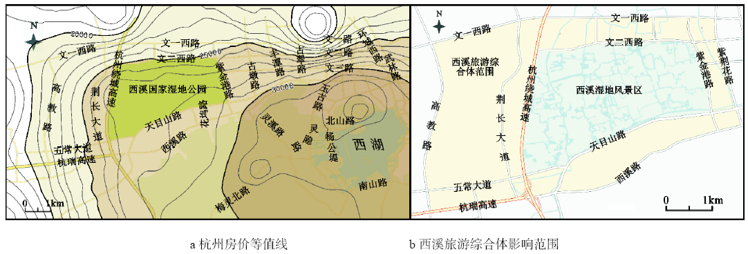 Fig.3 House price contour map of Hangzhou and sphere of influence in Xixi tourism complex